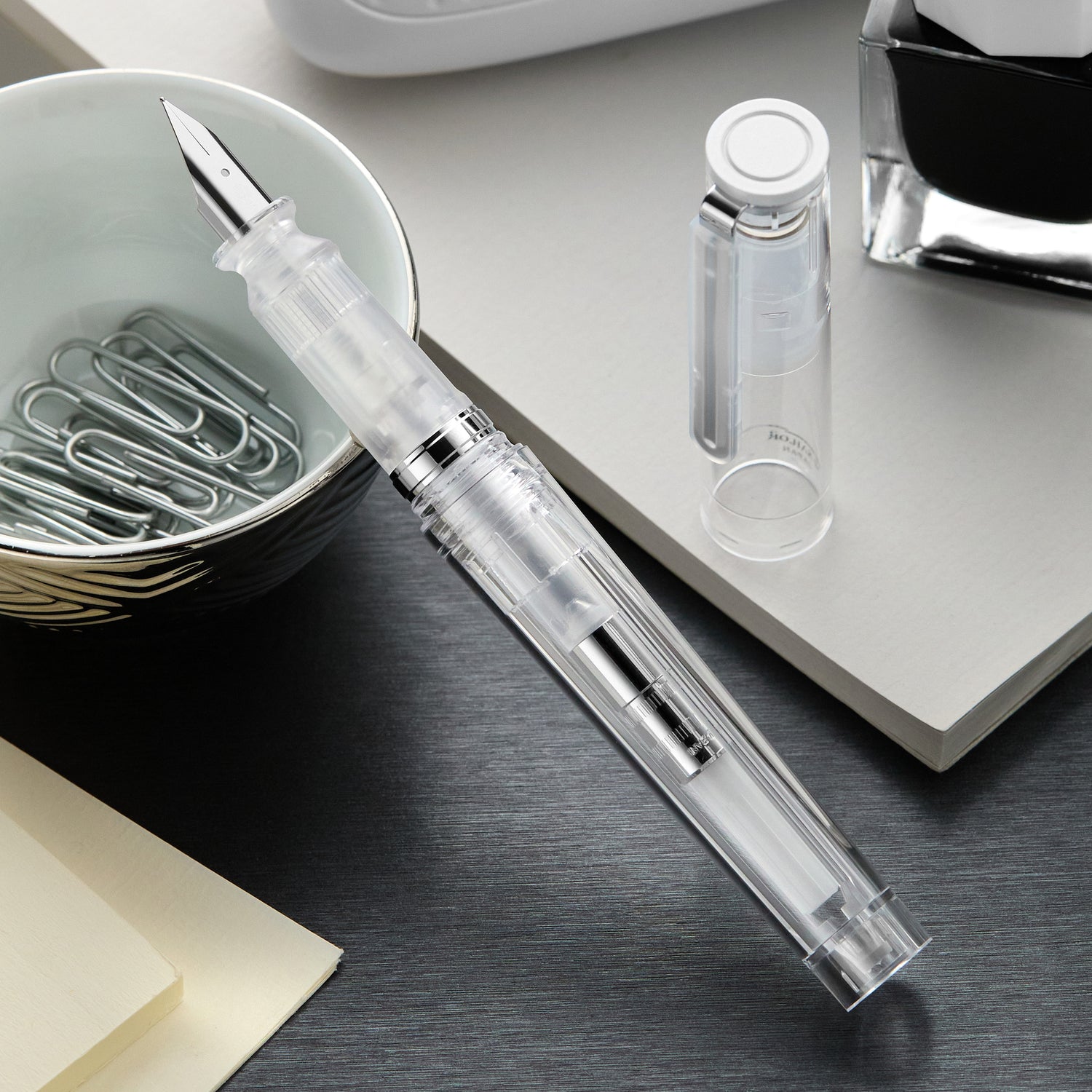 This demonstrator fountain pen is made from transparent resin parts. Its internal structure is clearly visible, giving it a mechanical charm and strong presence. Each pen comes with a stainless steel nib and Sailor's slide-type sealing feature in the snap cap to prevent ink from drying out.